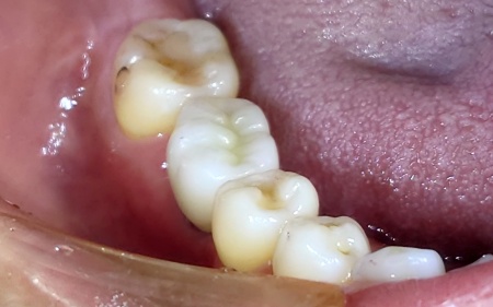拝見したところ、右下の奥歯が1本なくなっていました。 また奥歯が1本欠けたままの状態を放置すると、上の歯との噛み合わせが変わってしまったり、周囲の歯に負担がかかってしまったりすることがあります。 |