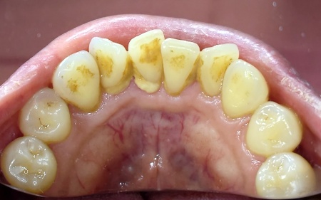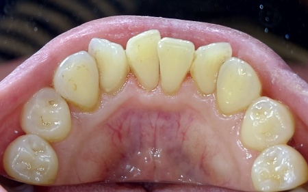 拝見したところ、下前歯の裏側と歯ぐきの境目を中心に歯石の付着が目立っていました。 歯石とは歯の表面に付着したプラーク(細菌のかたまり)が、磨き残しによって唾液中のミネラルと結びつき固まったものです。 プラーク自体はやわらかく毎日の歯磨きで取り除くことができますが、一度固まった歯石は歯ブラシでは除去できません。 このまま放置すると、汚れが溜まり続けるだけでなく、細菌が増えて歯ぐきに炎症を起こしやすくなる可能性があります。 現時点では、歯ぐきに強い腫れや出血といった大きな炎症は見られませんでした。 |