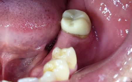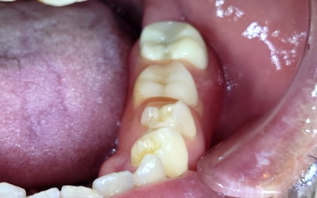 「数年前に左下奥歯が欠損したので保険診療の入れ歯を作ったが、うまく合わない。何かほかの治療方法がないか診てほしい」とご相談いただきました。 |